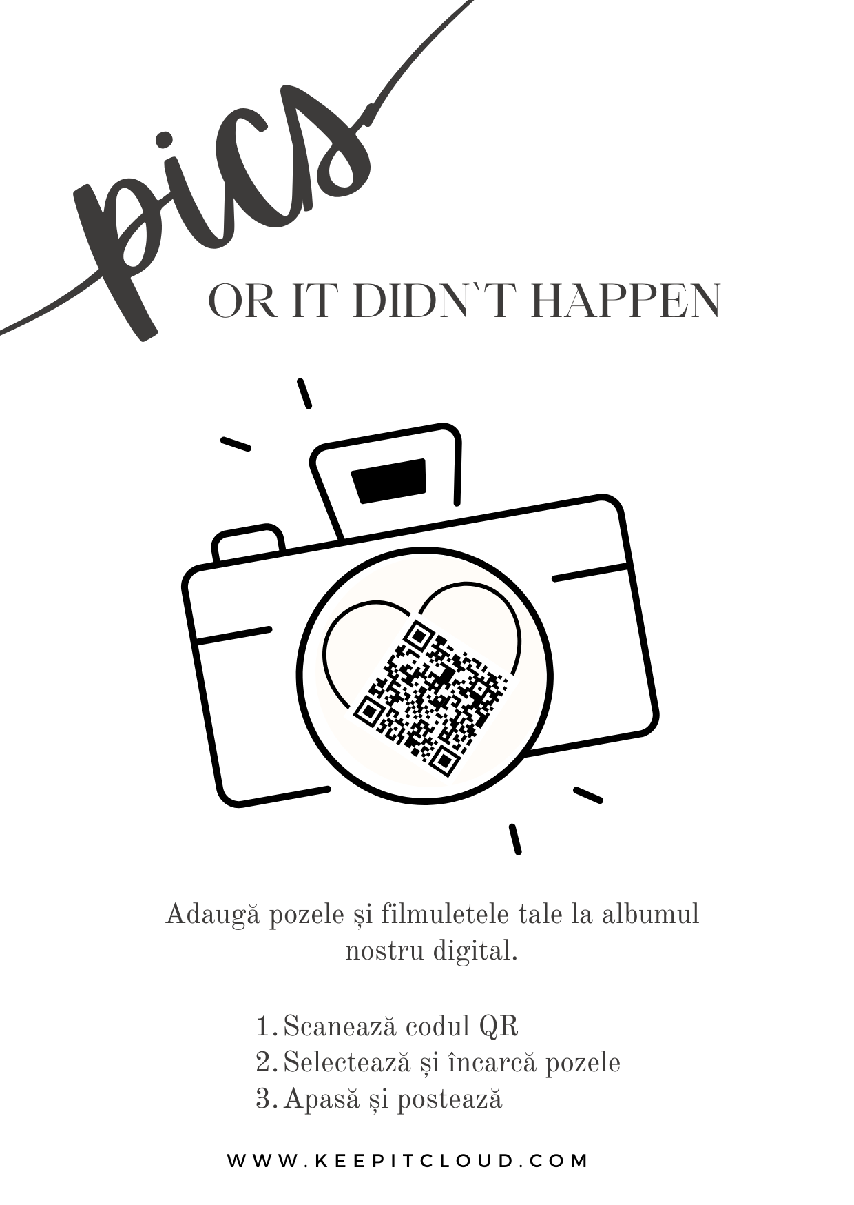 Keepitcloud este o platformă digitală specializată în galerii foto-video cu cod QR pentru nunți și evenimente, cu spațiu de stocare nelimitat și funcționare identică în România și oriunde în lume. Oferim o soluție modernă pentru colectarea pozelor și videoclipurilor de la invitați, fără aplicație și fără cont, direct din browser. Tot conținutul se adună într-un singur link securizat, ușor de distribuit și accesat de pe telefon, tabletă sau laptop. Suntem alegerea ideală pentru cupluri, organizatori de evenimente și companii care caută o alternativă sigură și profesională la Google Drive sau WhatsApp.